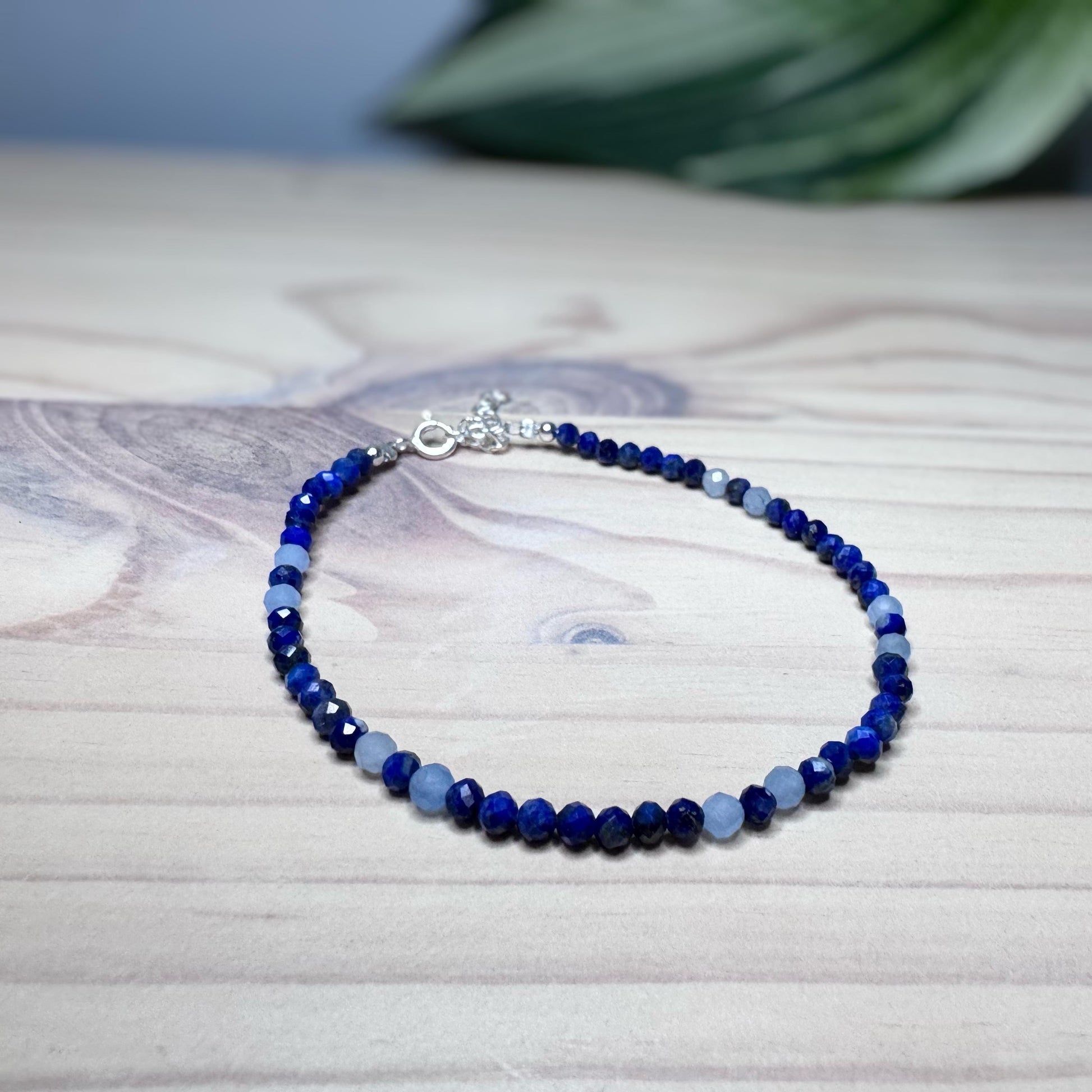 A delicate beaded bracelet handcrafted with faceted Lapis Lazuli and Aquamarine crystals. Finished with a sterling silver clasp, this minimalist bracelet is perfect for everyday wear, layering, or gifting.