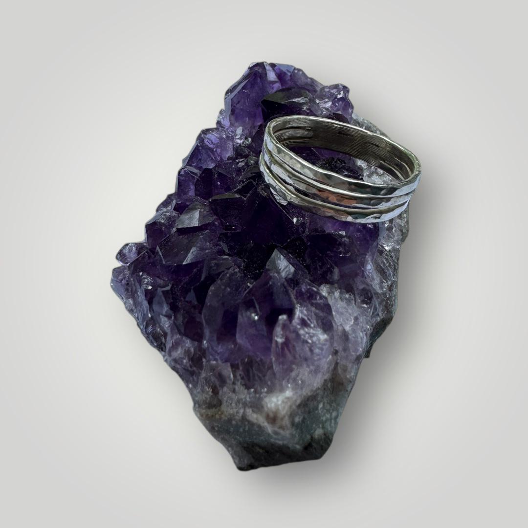A unique handmade ring crafted from three slim hammered silver bands, joined together to create a bold yet elegant design. The hammered texture reflects the light beautifully, giving this piece a beautiful finish. Perfect as a statement ring or for stacking with other favourites, it’s a versatile piece of jewellery that works for everyday wear or special occasions.